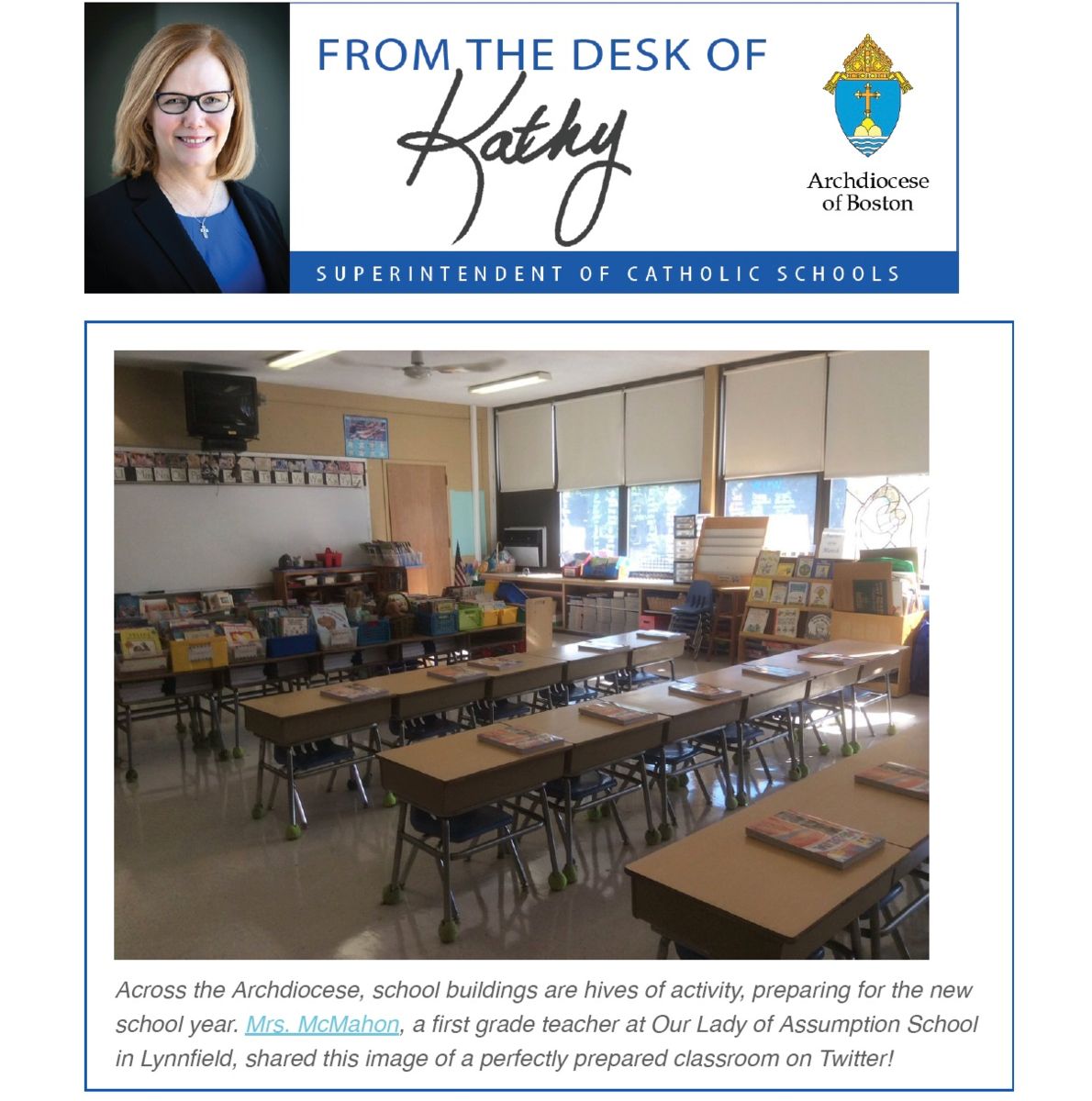 Our very own Mrs. McMahon is honored by the Superintendent of Catholic Schools for her model classroom! The caption reads: "Across the Archdiocese, school buildings are hives of activity, preparing for the new school year. Mrs. McMahon, a first grade teacher at Our Lady of Assumption School in Lynnfield, shared this image of a perfectly prepared classroom on Twitter!"