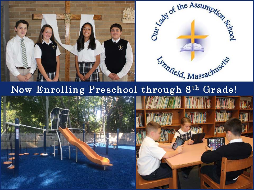 New parents who are interested in enrolling their child for the first time into the Our Lady of the Assumption School, Application and Registration forms are located under the Admission tab above. If there are any questions, please do not hesitate to contact the School Administrator, Amy Rogovich, at 781-599-4422.